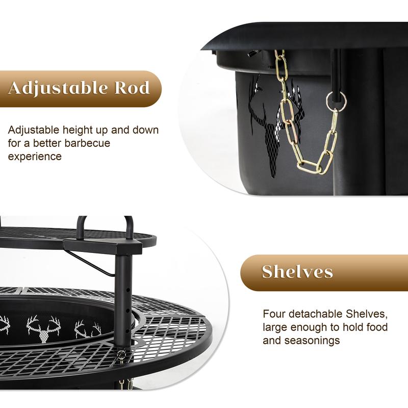 The durable steel fire pit with grates has a heat-resistant surface that can withstand high temperatures without warping.This fire pit is made of durable metal, designed in a round shape, and fueled by wood.